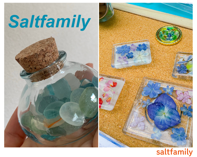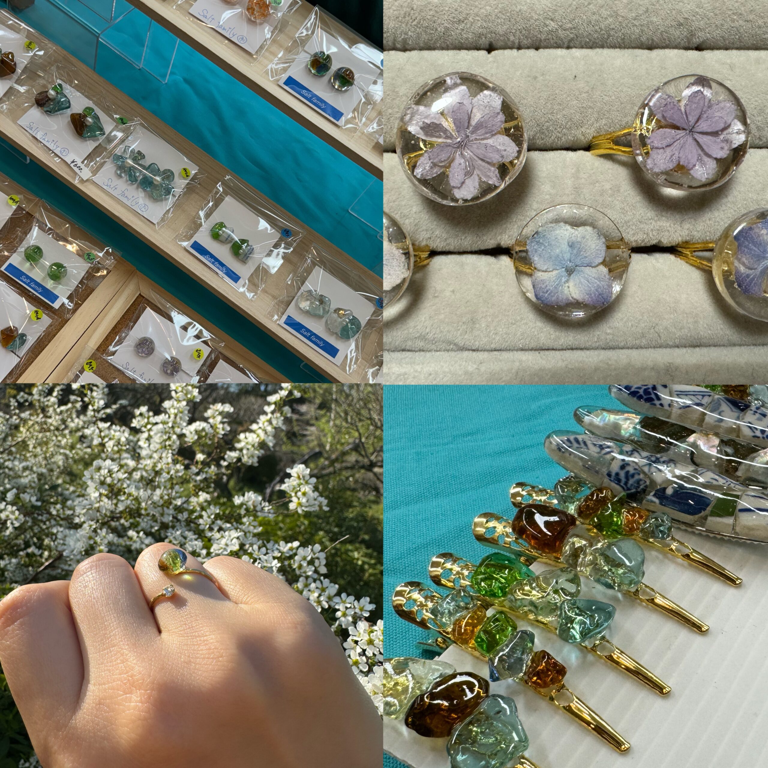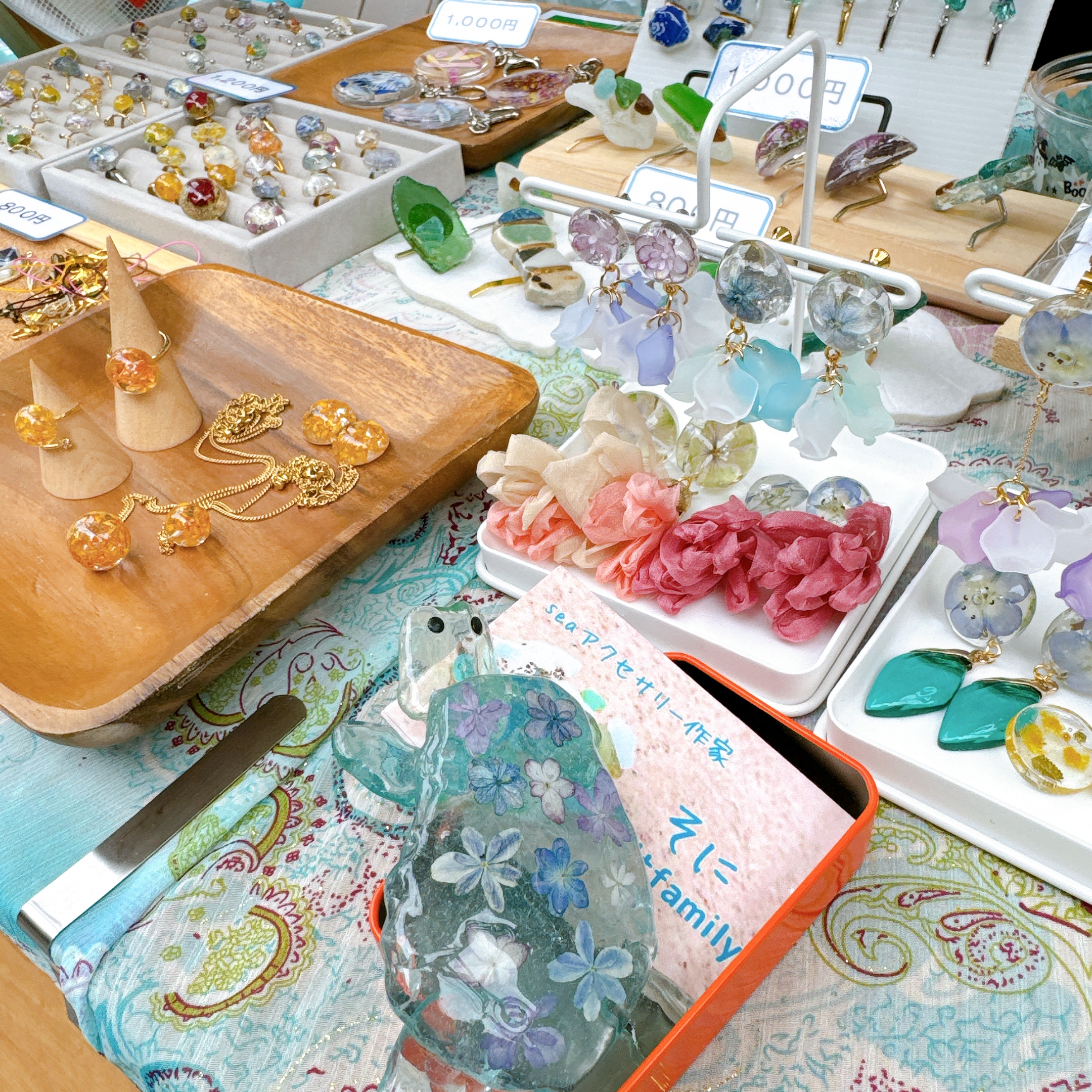 静岡県の海で集めたシーグラスやシー陶器、実家の庭で育った花々をドライフラワーにしたものをアクセサリーや雑貨に仕立てました。お喋り大好きな店主が商品の魅力をお伝えしながら接客します。