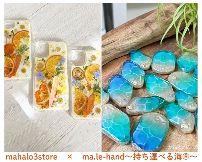 ma.le-handでは一年中〜持ち運べる海®〜をテーマに、沖縄県産渡嘉敷島や竹富島の砂等、天然素材を使ったアクセサリーや樹脂で作ったジオラマの様な海アート、アート雑貨作品を制作しております。