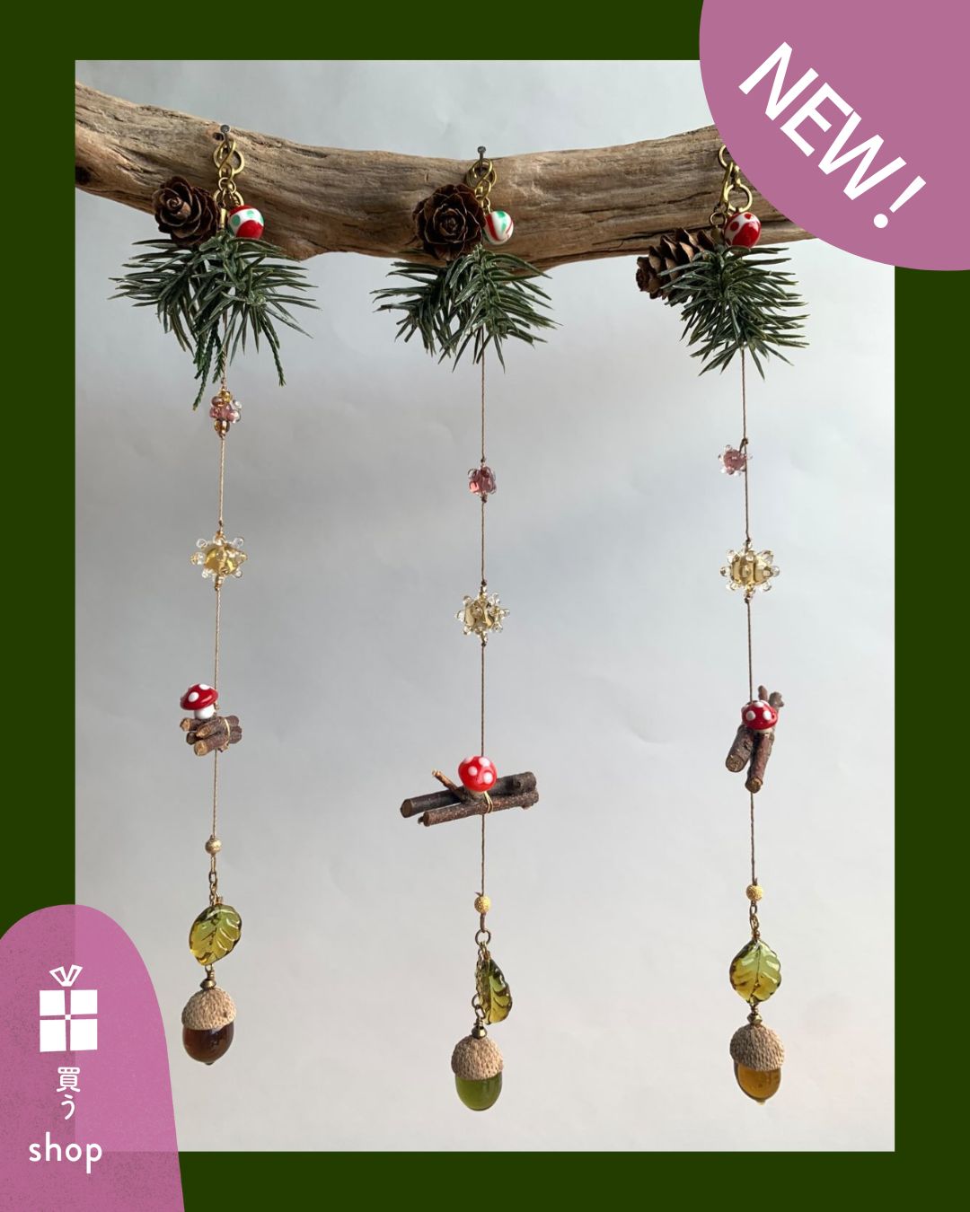 薬師池で採集したどんぐりの「ぼうし」部分を活かし、さまざまな表情のどんぐりオーナメントが並びます。